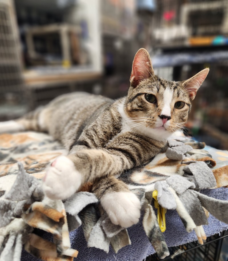 | Brett is a 10-month-old, polydactyl, neutered male. He is up to date on vaccines and microchipped. He would be best in a quiet home with other cats. |